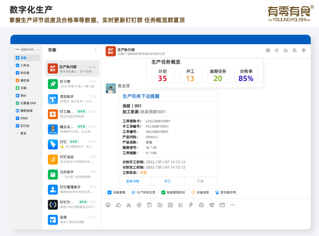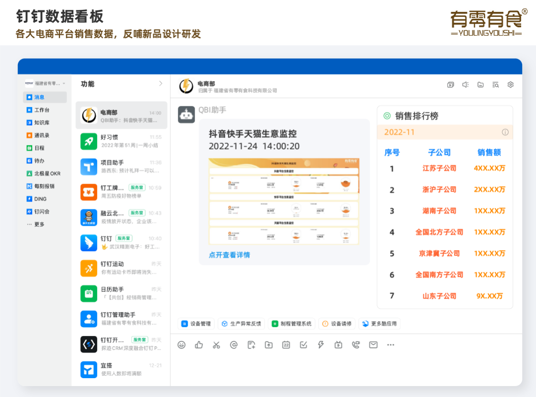通过群里的酷应用每天自动推送市场数据分析看板,管理层可以第一时间看到新品研发风向标,一个个水果冻干网红新爆款就这样在钉钉群里产生。