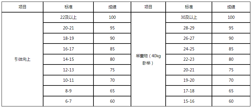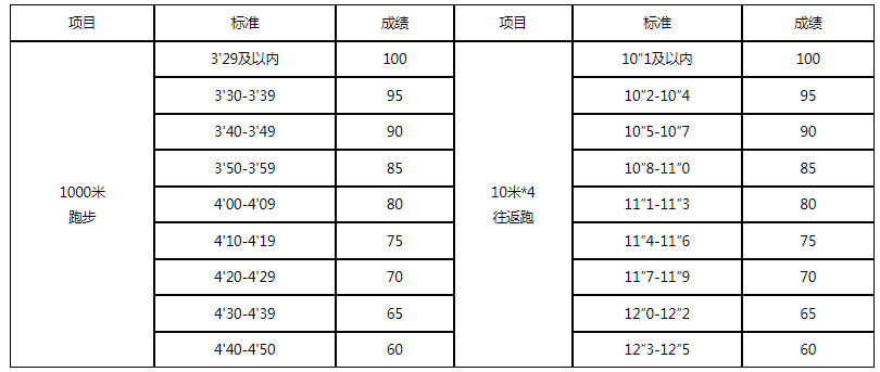 2.3体能测试成绩满分为100分,1000米跑(或引体向上)与10米×4往返跑(或举重物(40kg卧举))两项成绩各占体能测试成绩的50%,体能测试成绩占总成绩的40%。