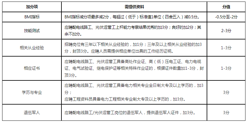 备注:应聘配电线路工、光伏运营工加分项累计不超过10分;应聘工程资料员加分项累计不超过5分。