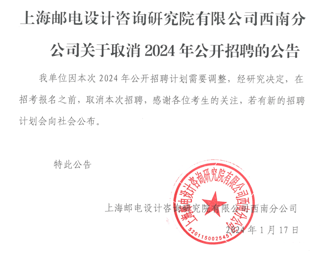 上海邮电设计咨询研究院有限公司西南分公司关于取消2024年公开招聘的公告