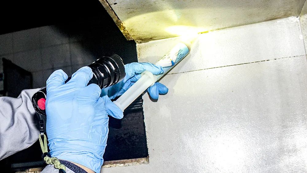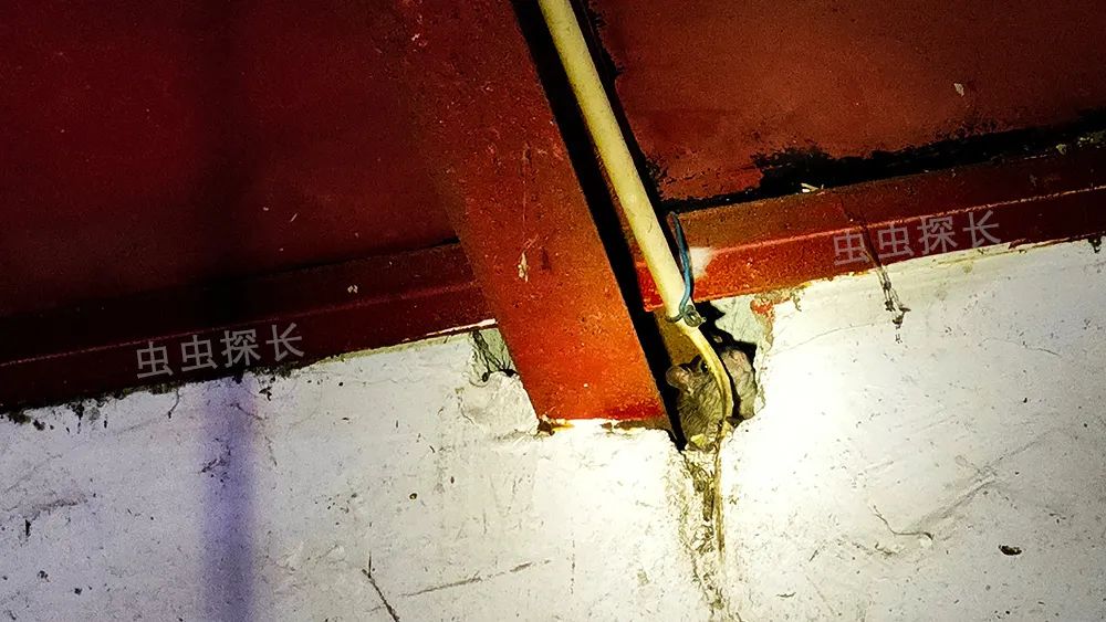 餐饮店危害的老鼠主要有黄胸鼠和褐家鼠。黄胸鼠善于攀爬,褐家鼠擅长在地沟游泳,它们可以通过墙壁孔洞、下水道管道、排水沟、天花板、门窗等部位的孔、洞、缝(口径大于6mm或10mm)进入室内。比如下图墙壁上的老鼠从工型钢孔洞处进入室内,被虫虫探长拍个正着。