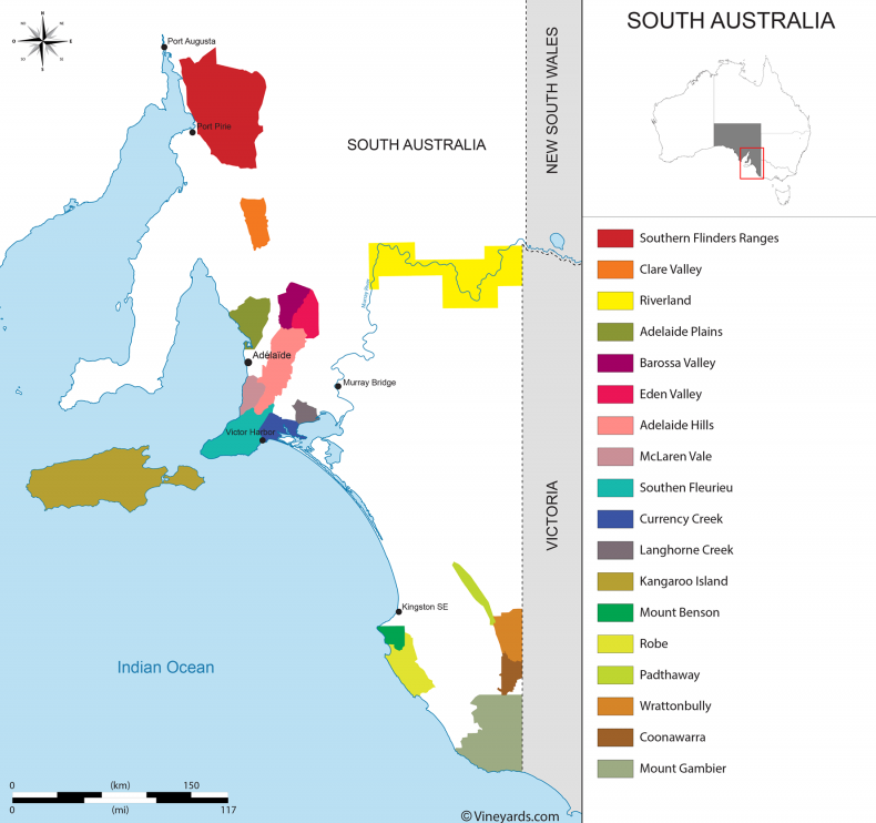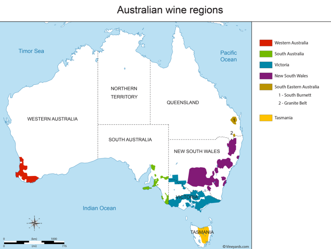 澳大利亚是一个巨大而多样的葡萄酒产区,有超过100种葡萄品种和65个不同的葡萄酒产区。主要分为五个葡萄种植区:新南威尔士、维多利亚、塔斯马尼亚以及昆士兰和南澳大利亚的部分地区。然而,该国的酿酒葡萄大多生长在东南部地区,北部过于炎热,中部又干燥又炎热。仅南澳大利亚州就生产了全国一半以上的葡萄酒。它是澳大利亚最干燥的州,而澳大利亚是世界上最干燥的大陆。