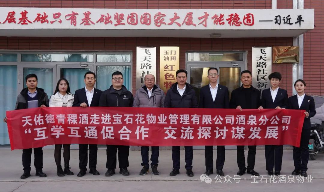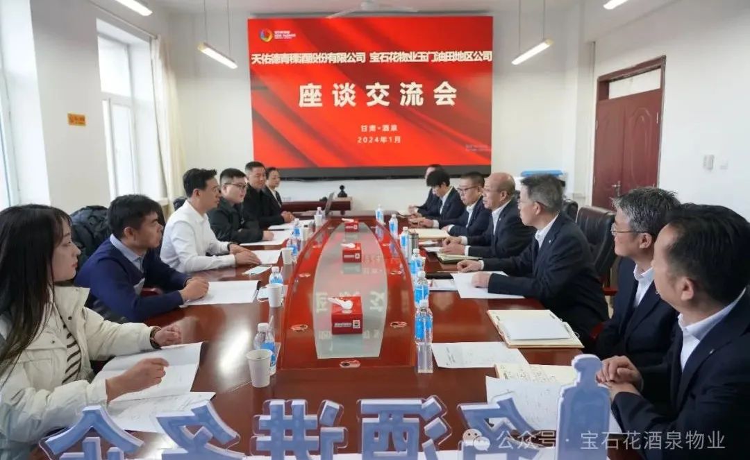 宝石花物业玉门油田地区公司总经理对天佑德青稞酒公司一行的来访表示欢迎,对天佑德青稞酒公司的支持和关心表示感谢。他表示,天佑德青稞酒公司有着悠久的历史,有着跨地区、走出国门的荣耀,有着众多的荣誉和资质,有信赖的品质以及上市企业的责任与担当,值得我们学习借鉴。宝石花物业玉门油田地区公司以“争做有温度、有情怀、有责任、有追求的大物业公司”为发展使命;以“致力于打造值得信赖的物业服务企业”为发展愿景,赓续石油摇篮85年的红色物业基因,持续打造36.5度温暖社区。双方有着深厚的合作基础、合作愿景,有着共同为民服务的使命,有着共同服务好千家万户的责任,要进一步挖掘合作潜力,找准定位,明确方向,加强学习交流、加强互动沟通,实现相互促进、互利共赢,为满足广大住户对美好生活向往做出更多努力。