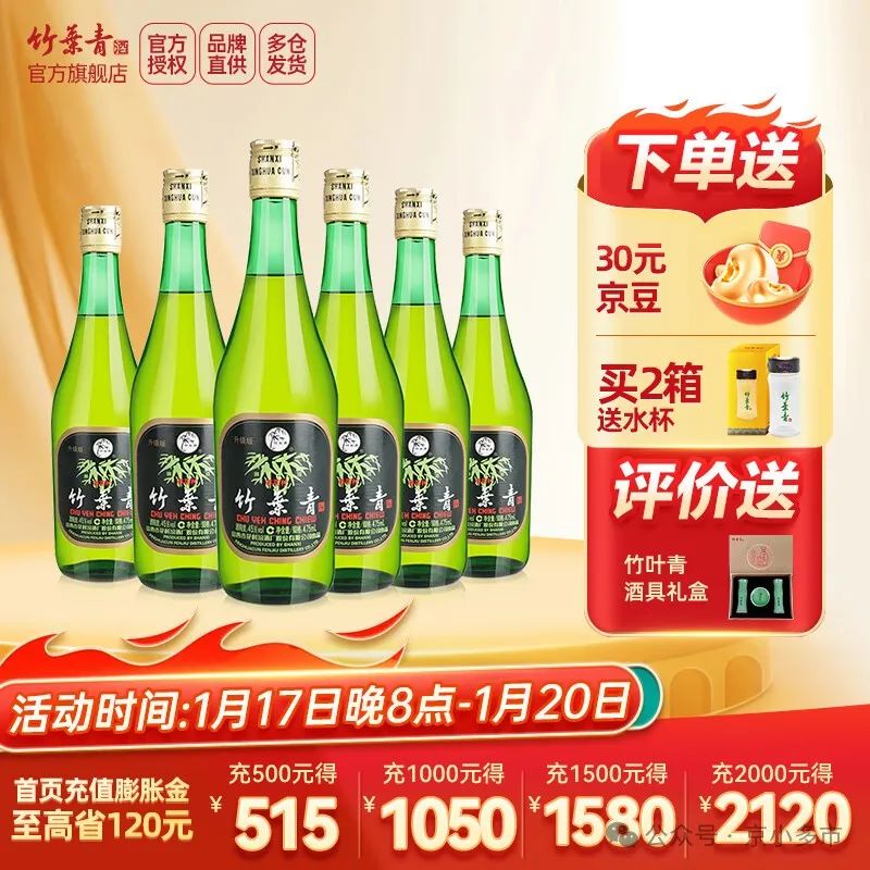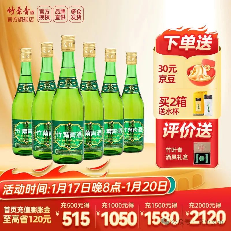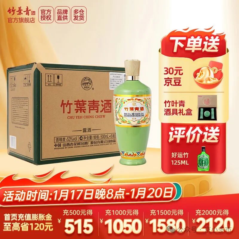 竹叶青酒 荣耀 绿瓶 山西杏花村汾酒 优质清香型汾酒基酒 露酒 53度 500mL 6瓶 原箱