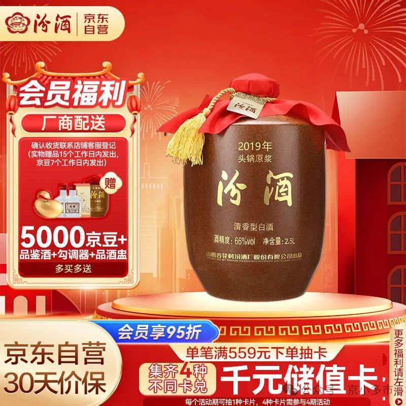 汾酒 2019年头锅原浆 清香型高度白酒66度2.5L封坛酒收藏摆柜年货送礼