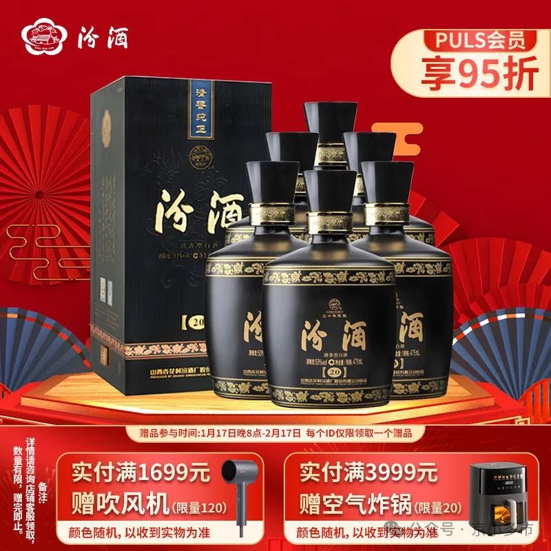 汾酒 黑坛金奖20 清香型白酒 53度 475ml*6瓶 整箱装
