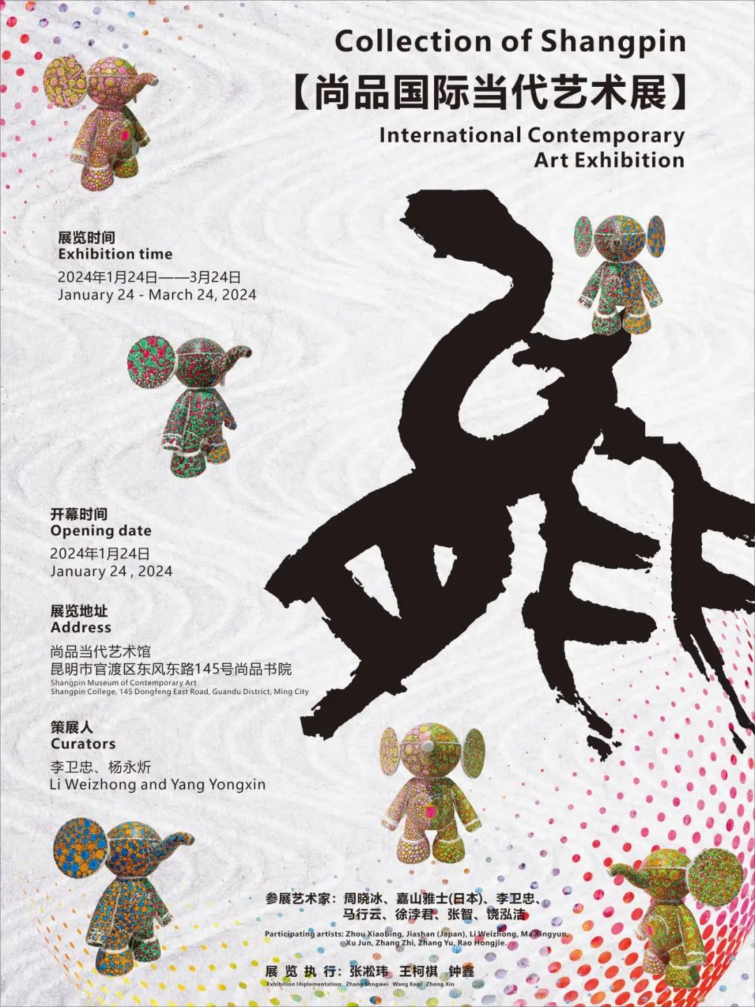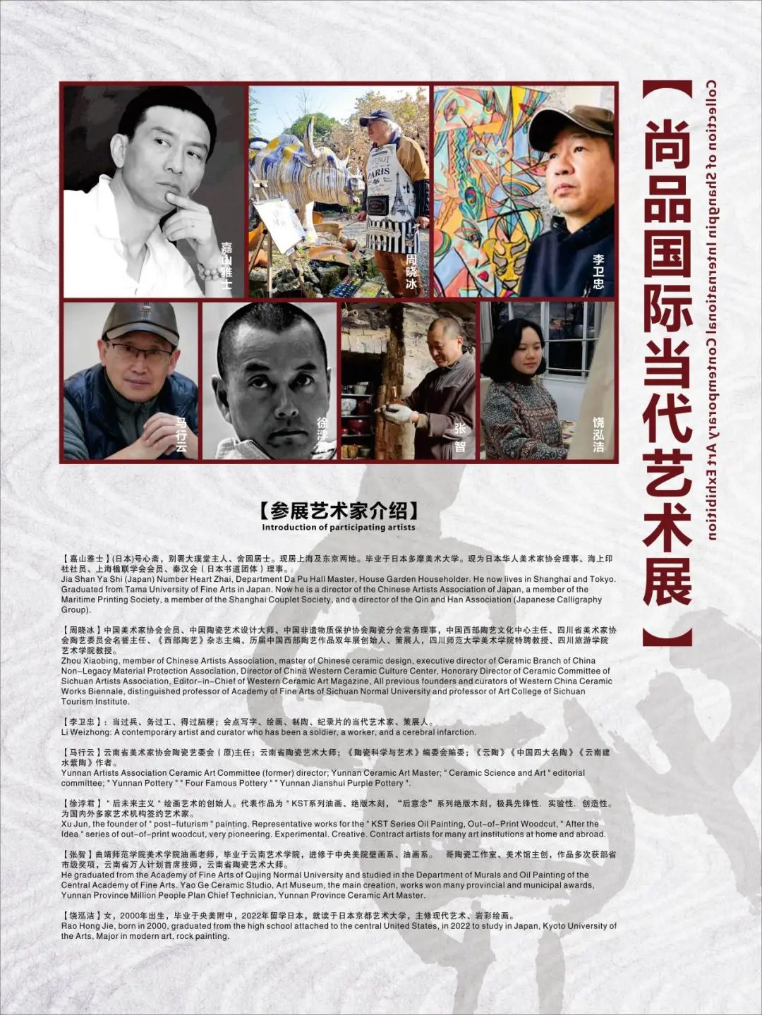当代艺术绘画作品59件,其中有日本现代书法、当代纸本,架上丙稀、油画,后未来主义综合材制,绝版木刻,日本岩彩画、绢本画、潮玩,数字复刻版画;当代陶艺作品30件;涵盖景德镇青花瓷、曲靖潦浒柴烧陶瓷、建水紫陶、昆明陶;影像单元:银盐套色摄影、七部人文纪录片,内容含盖艺术家传记文献影像、云南沧源岩画、佤族人文历史,风情,歌舞;有记录讲述中国当代艺术文化社区发祥地的昆明创库,千年潦浒陶瓷古镇,许多资料属国内第一次展示,影像在国际当代艺术展中较为普遍、也是构成一个展览的重要组成部分。