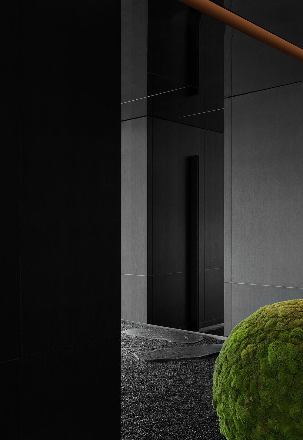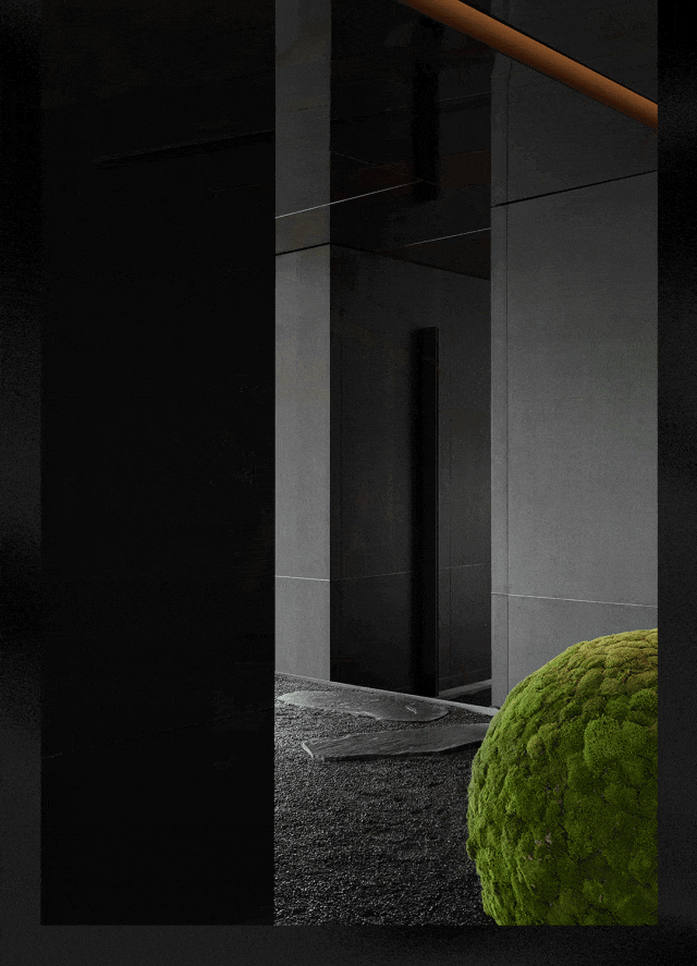 通过室内墙壁的掩映与透露,引申出自然的空间秩序。斜墙构筑入口迂回,控制动线之余也保留内部环境隐蔽性。
