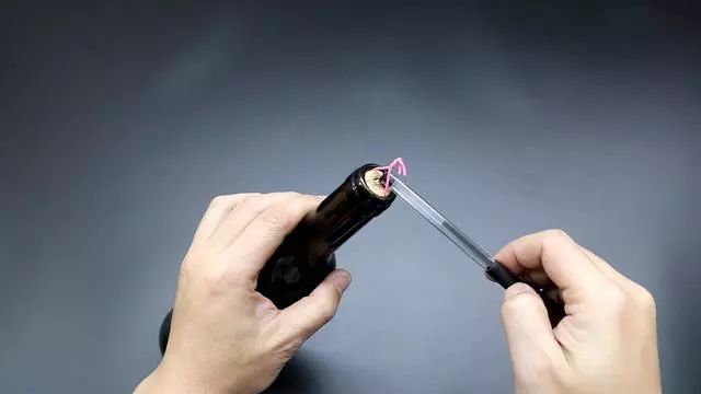 回形针固定好以后,我们在中间打上一个结,然后用一支笔就可以慢慢的往外把木塞提出来了。