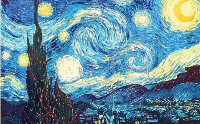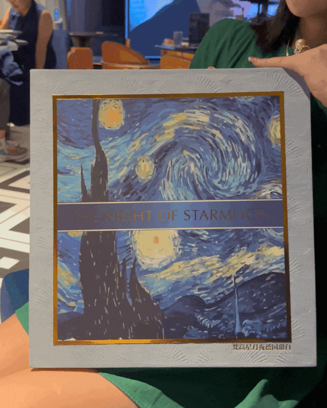 礼盒满满的细节,中间是梵高著名画作“星夜”,高度夸张变形的星空营造出强烈的视觉对比。