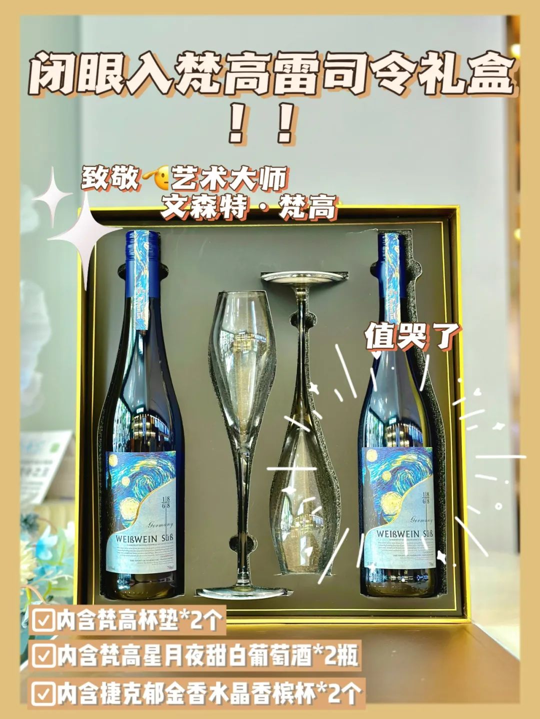梵高星月夜雷司令礼盒 一整套=香槟杯*2+梵高手册*1+酒杯垫*2+德国雷司令甜白*2+梵高艺术礼盒*1 开团价:188 ⬇️点击下图即可购买⬇️