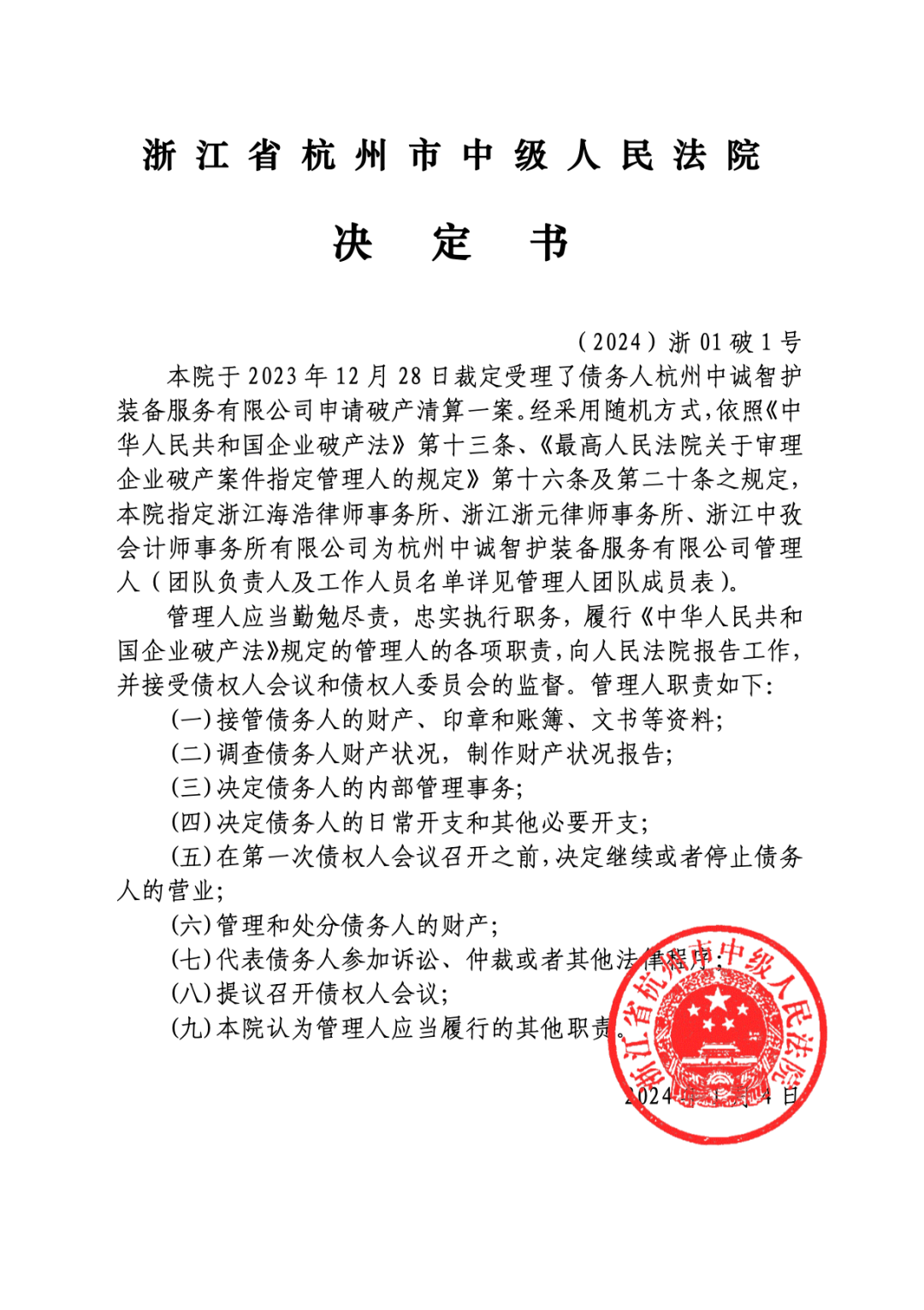 为保证杭州中诚智护装备服务有限公司申请破产清算案债权申报工作合法、有序进行,管理人现就申报债权时的相关事项说明如下: