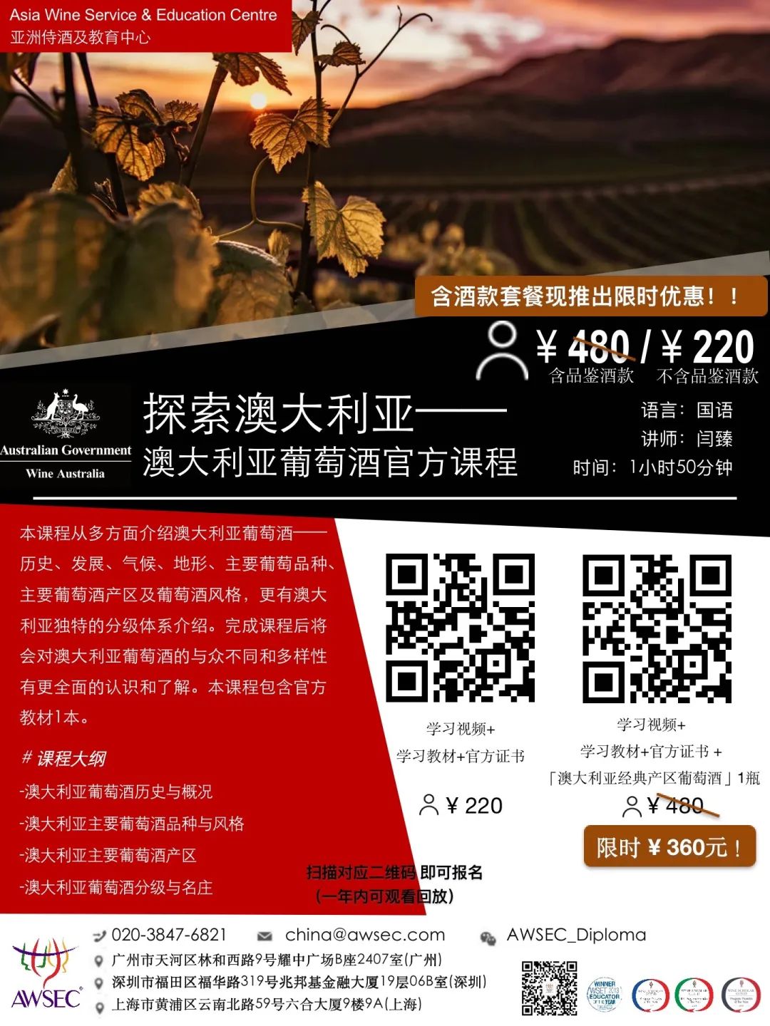 想全面了解这个充满创造力的葡萄酒“美丽新世界”吗?来和我们一起举杯相约,感受澳大利亚葡萄酒的多样与热情吧!