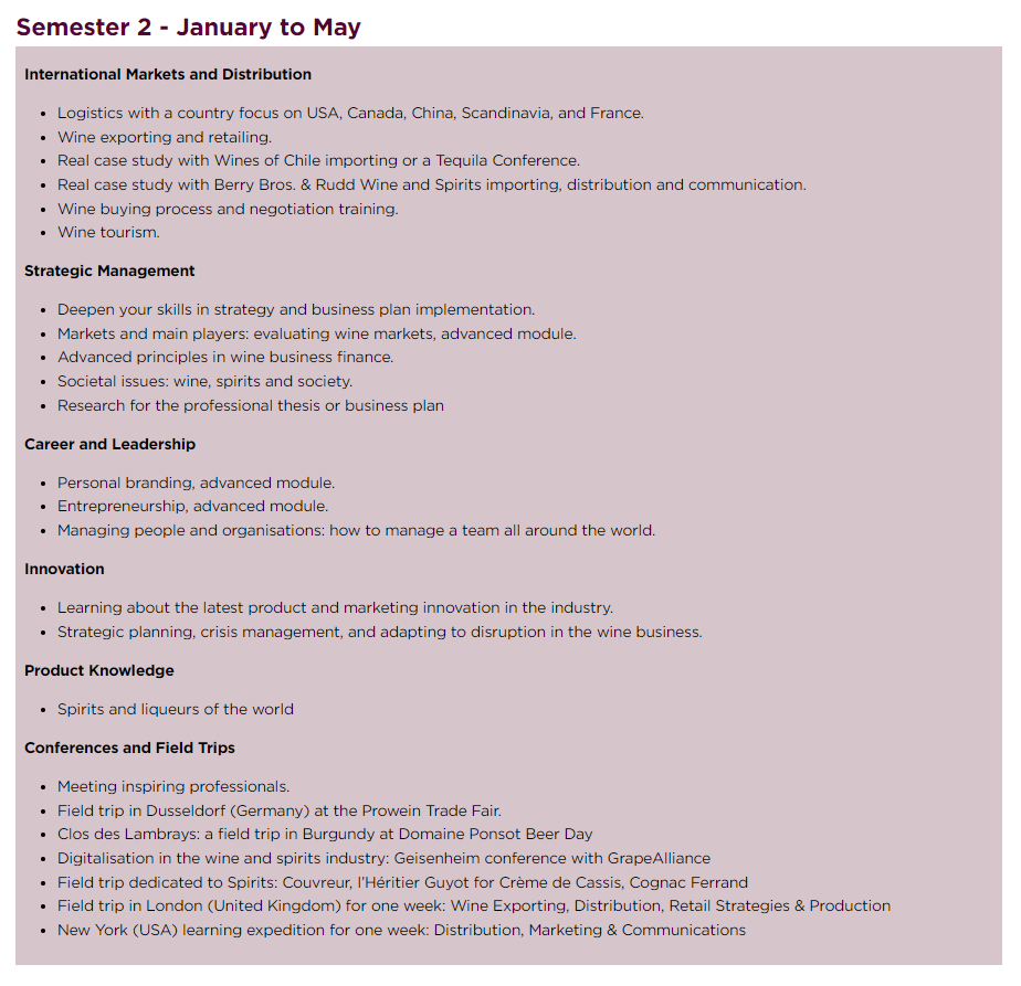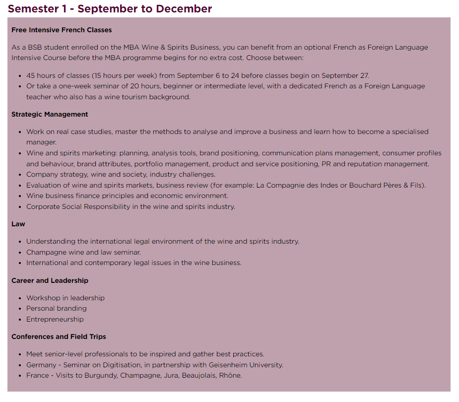 葡萄酒与烈酒行业的沉浸式体验。包括多样化的游学项目(时长最长可达5周)以及法国著名葡萄酒产区实地考察(勃艮第、罗纳河谷以及香槟产区);葡萄酒与烈酒行业的领军者会为MBA项目学生定期举办讲座,行业沙龙:在德国举办的葡萄酒及烈酒博览会(Prowein)。