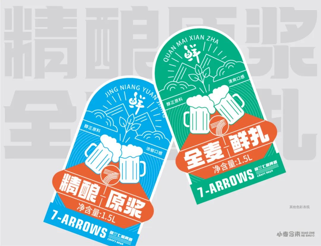 包装定位主要依据产品的特点及其品牌形象,精酿原浆的浓郁、全麦鲜扎的清爽,进取、挑战、创新的品牌个性都是包装面向市场体现出的直观表述。选用贴标能更好体现啤酒本身清透、淡爽的特征。