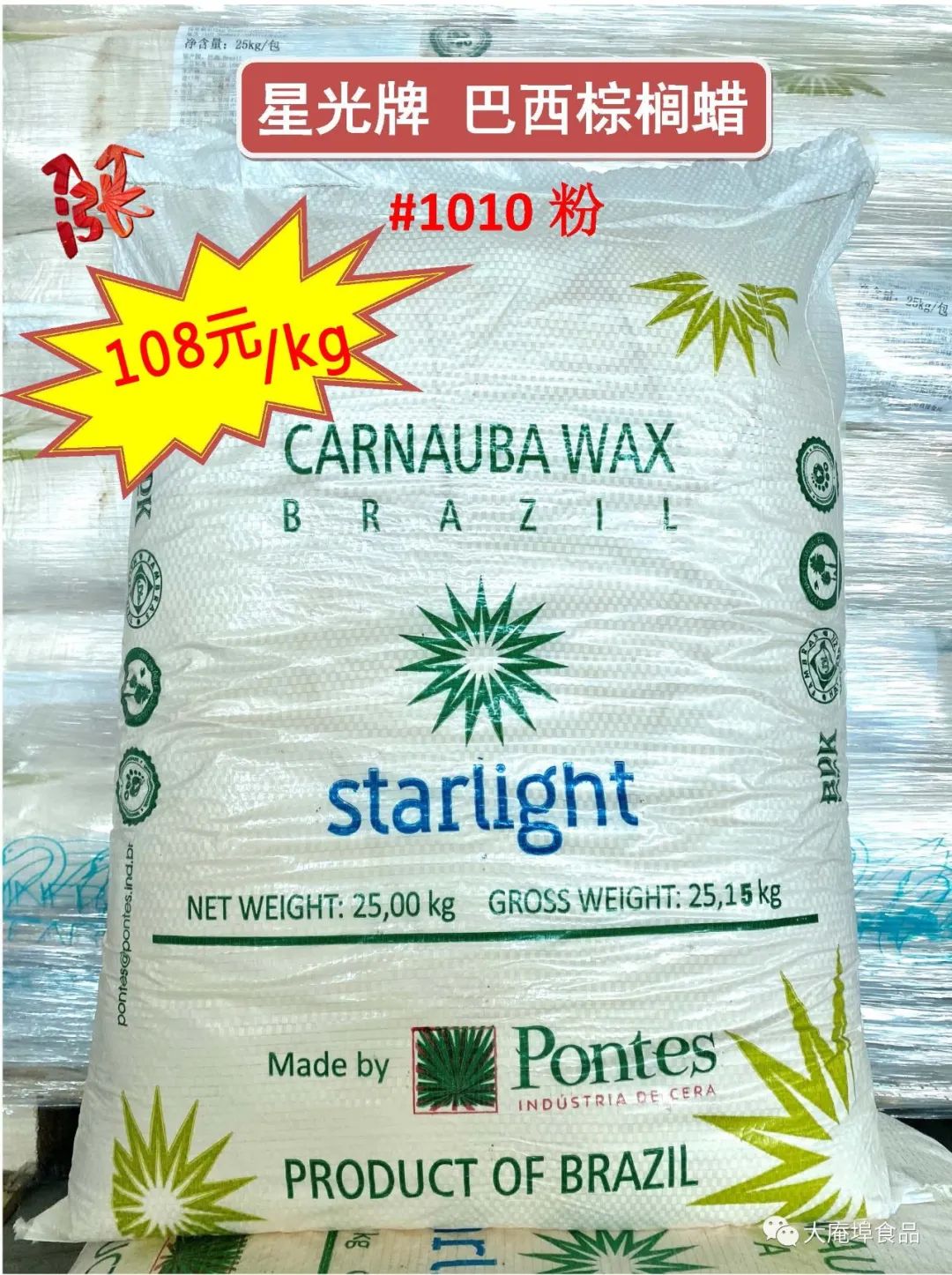 我司经营的星光牌食品级巴西棕榈蜡,因高亮的天然光泽性能和防潮湿作用,特别适用于糖果糖衣,巧克力,压片糖,口香糖等等的表层包衣抛光起光。
