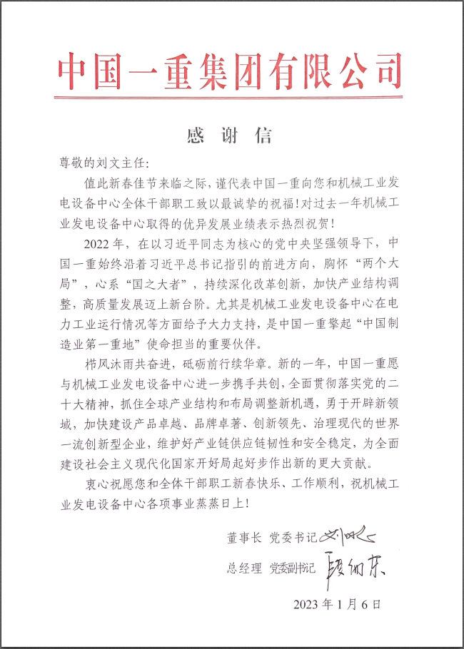 新的一年,机械工业发电设备中心将与行业企业进一步携手共创,全面贯彻落实党的二十大精神,抓住全球产业结构和布局调整新机遇,勇于开辟新领域,维护好产业链供应链韧性和安全稳定,为全面建设社会主义现代化国家开好局起好步作出新的更大贡献。