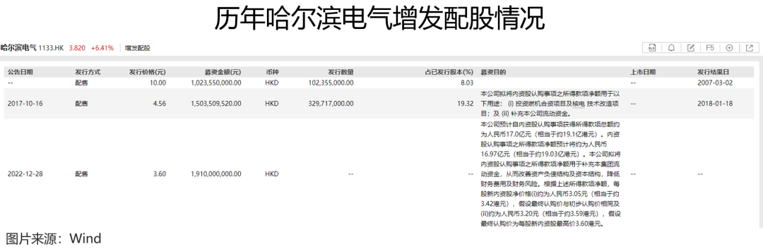 基于以上的情况,哈尔滨电气在此次配售之前仅有两次配售融资。第一次在2007年,彼时公司市净率在2.5倍左右,公司股价处在92.60%的历史位置,共计募集资金10.23亿港元。第二次在2017年,与此次情况类似,大股东以认购新内资股的方式注资哈尔滨电气,融资规模共计15.04亿港元。