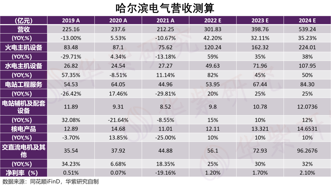 (1)火电主机设备业务:随着煤电改造政策的落实,作为占据三分之一火电设备市场巨头的哈尔滨电气业绩有望充分释放,笔者预计2022-2024年公司火电主机设备业务增速为59%、35%和38%。