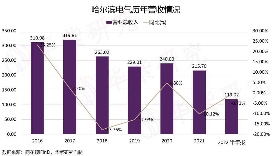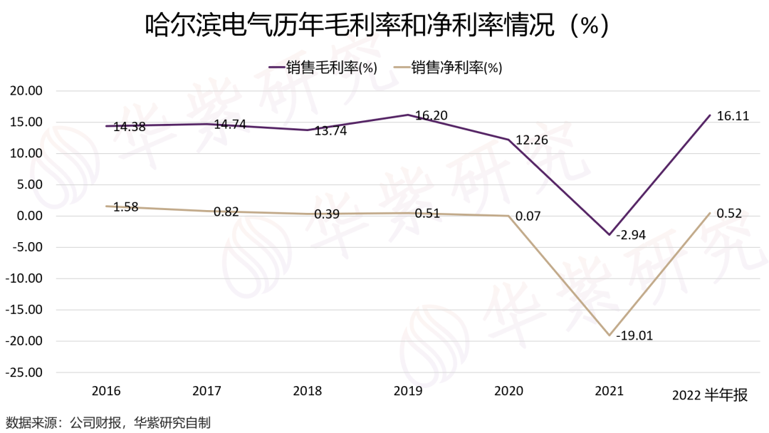 2022年上半年公司实现营收119.02亿元人民币,同比录得0.73%负增长,较2021年10.12%的负增长有了明显的改善。利润方面,2022年上半年实现扭亏为盈,为0.52亿元人民币,同比增长50.37%。一方面,公司加强了对管理费用的把控,管理费用率从2021年的7.27%下降至2022年上半年的4.19%,带动公司三费率整体下行,增厚公司利润。另一方面,水电主机设备和交直流电机等高毛利业务营收占比不断提升,推动利润增长,转型效果初步显现。