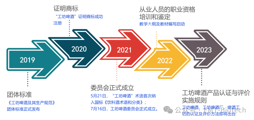 中国酒业协会啤酒分会及工坊啤酒专业委员会长期致力于建立工坊啤酒行业的规范化发展。从2019年制定、发布、实施和宣贯《工坊啤酒及其生产规范》团体标准;到建议《产业政策指导目录》删除啤酒业限制类和淘汰类相关条款;将工坊啤酒生产许可审查细则审查单元;再到申请注册“工坊啤酒及英文及图形”证明商标:2019年,为进一步规范工坊啤酒行业发展,保护工坊啤酒的特定品质,保障消费者利益,协会于2019年正式开展“工坊啤酒及英文及图形”证明商标申请工作,并于2021年4月正式完成注册。2021年7月,在工坊啤酒专业委员会成立大会上,“工坊啤酒及英文及图形”使用管理规则正式发布。