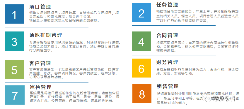 由慧展软件历时两年,专注于国内会展场馆运营管理及对外服务特点,研发了具有自主知识产权的国产化会展场馆运营管理系统,该管理系统覆盖场馆运营业务的各个方面。