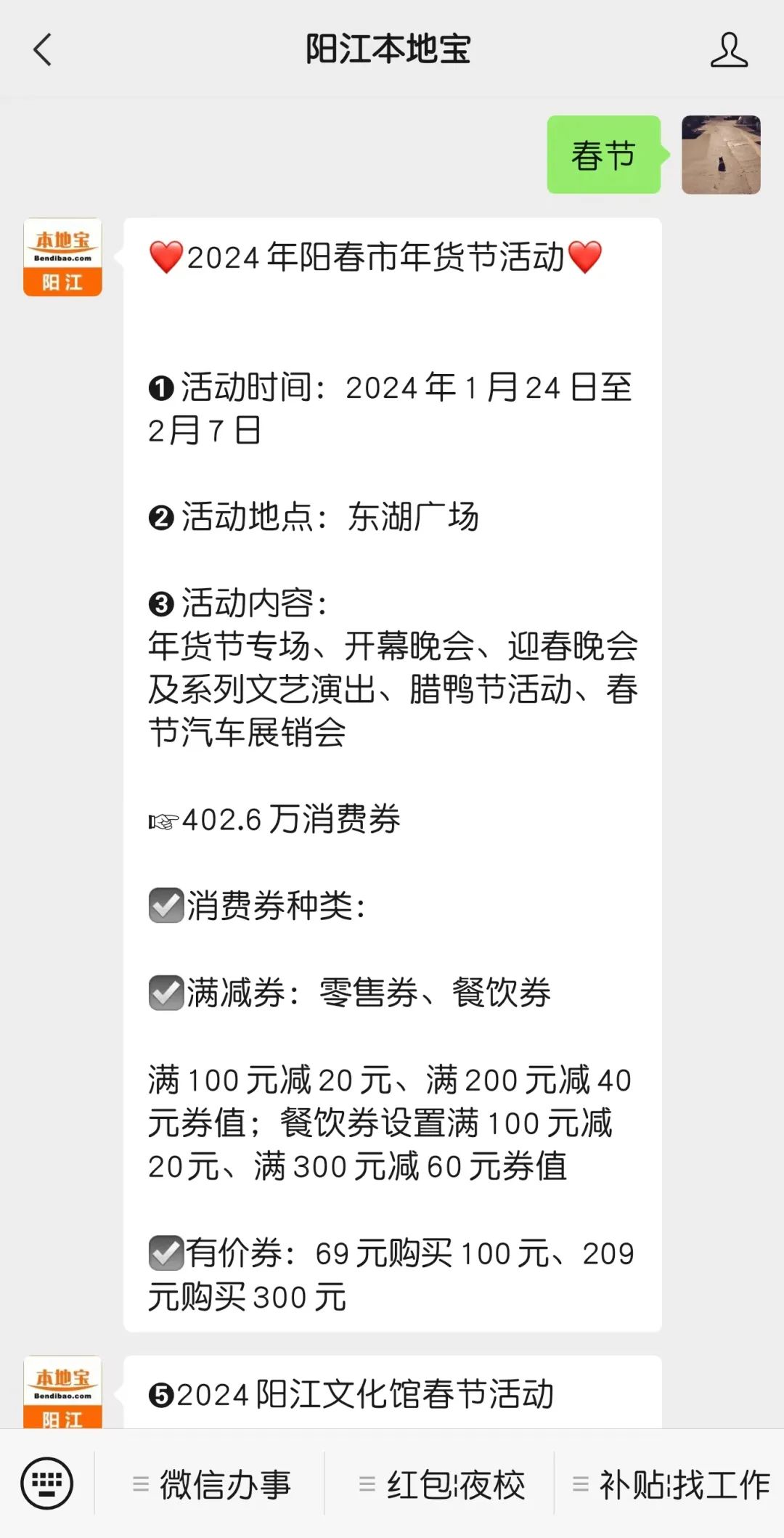在对话框回复【春节】获得活动时间、地址、活动安排、消费券领取等活动信息