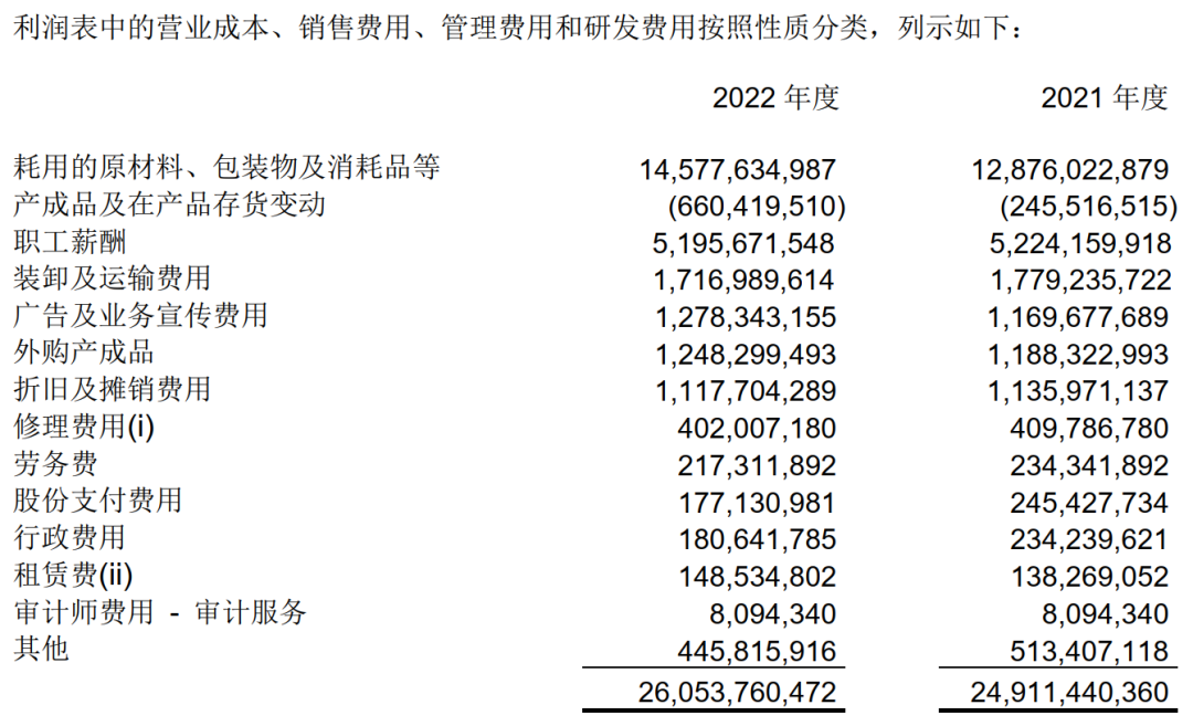 2022年成本和费用项目明细如下: