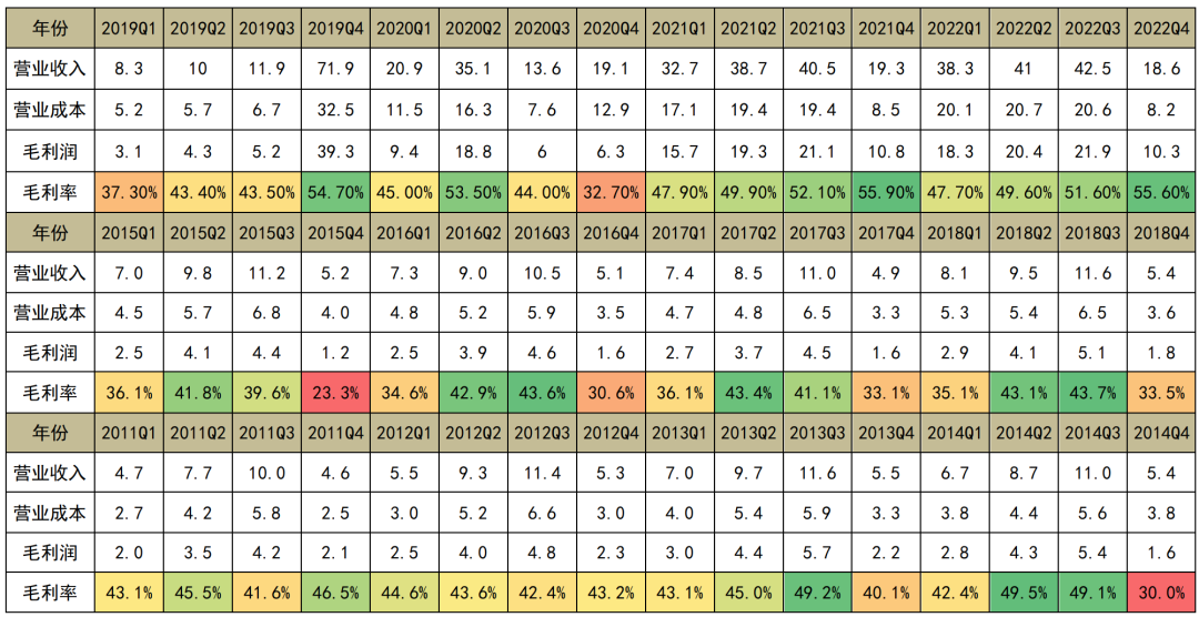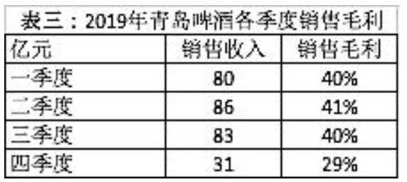 笔者注:由于不具备四季度产品均价的数据,上述推论并不一定完全准确。以重庆啤酒历年数据进行对比,四季度和一季度通常销售额较低,但毛利率却不一定低,有不少年份四季度毛利率是最高的。