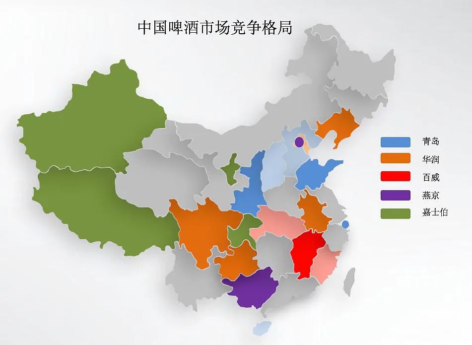 上图是中国啤酒市场的竞争格局,五大巨头各自有基地市场: