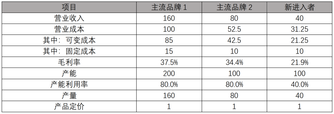 产能投资具有规模经济属性,新进入者面临产能规模和产能利用率的双重劣势。以下表为例,在不考虑销售费用和管理费用规模经济的情况下,新进入者面临显著的成本劣势。