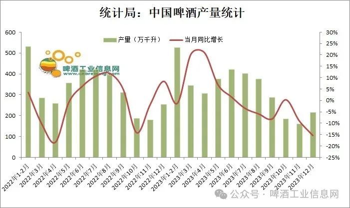 据统计局数据显示:2023年12月,中国规模以上企业啤酒产量214.5万千升,上月为159.7万千升,同比大降15.3%,创下2022年5月以来最大单月降幅。