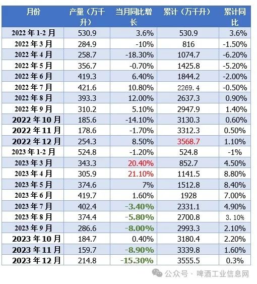 2023年1-12月,中国规模以上企业啤酒产量3555.5万千升,同比增长0.3%(若于同期公布累计数为3568.7万千升,实际减少0.37%)。