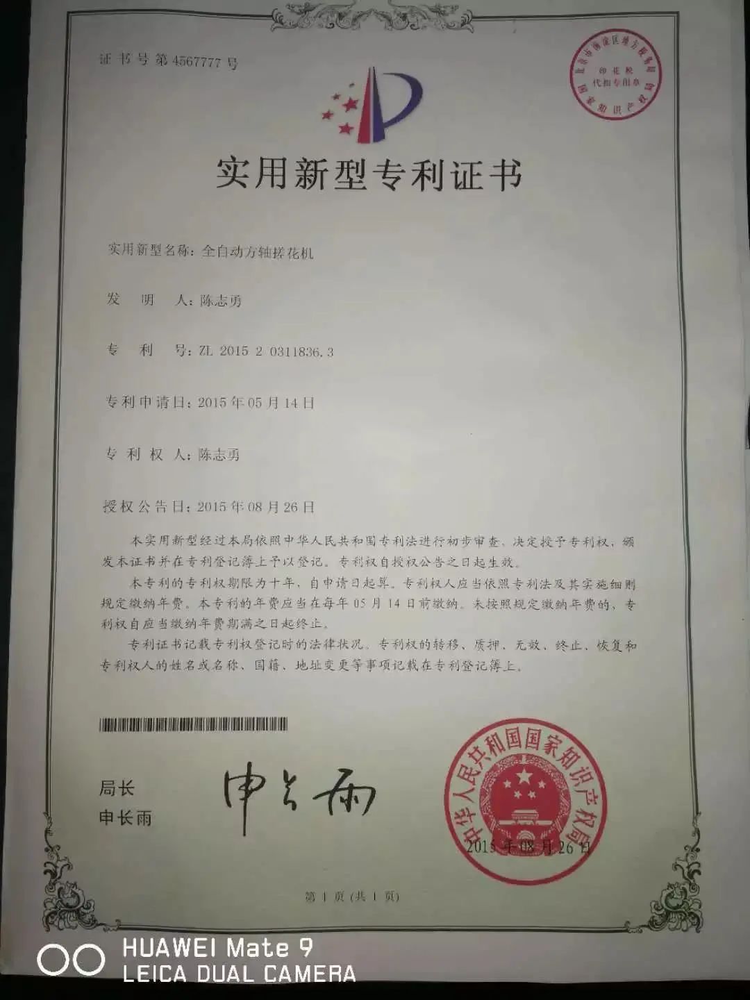 自产设备专利证书
