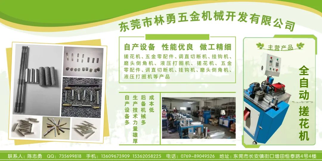 东莞林勇五金机械开发有限公司是搓花机、五金零配件、调直切断机、挂钩机、磨头倒角机、液压打圈机等产品专业生产加工的私营独资企业,公司总部设在东莞长按街口,东莞林勇五金机械开发有限公司拥有完整、科学的质量管理体系。