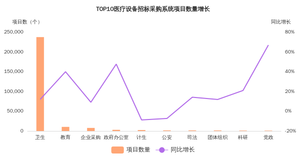 主要采购系统中,党政系统、政府办公室系统、教育系统项目数量增长较快,项目数量同比增长率分别达到67.0%、47.7%、40.0%。主要系统项目数量增长如下图: