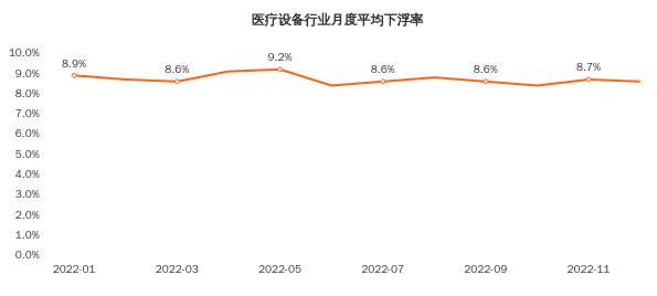 2022年1-12月医疗设备行业招标采购平均下浮率为8.7%,其中2022年5月月份平均下浮率达到最高为9.2%,2022年10月下浮率最低为8.4%。