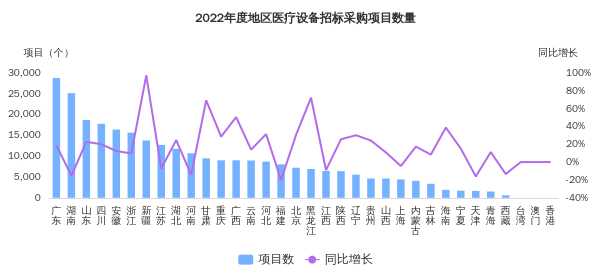 2022年1-12月医疗设备行业招标采购,广东、湖南、山东项目数量较高,分别达到28734个、25108个、18689个,前3地区占全国项目数的25.4%。其中新疆、黑龙江、甘肃成长较快,项目数同比增长率分别达到96.9%、72.1%、69.1%。主要地区项目数量分布如下图: