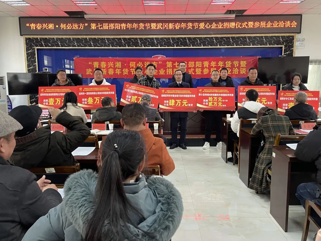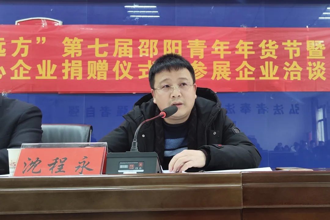 会议举行了爱心企业捐赠仪式,为湖南武冈农村商业银行、长沙银行邵阳分行、武冈市聚乡谷农业发展有限公司、武冈市一源贸易有限公司、黄小豆传媒&时尚圈、武冈市双全食品有限责任公司、湖南乡乡汇食品有限公司7家爱心企业进行了授牌,爱心企业、参展企业代表武冈市聚乡谷农业发展有限公司负责人上台发言。