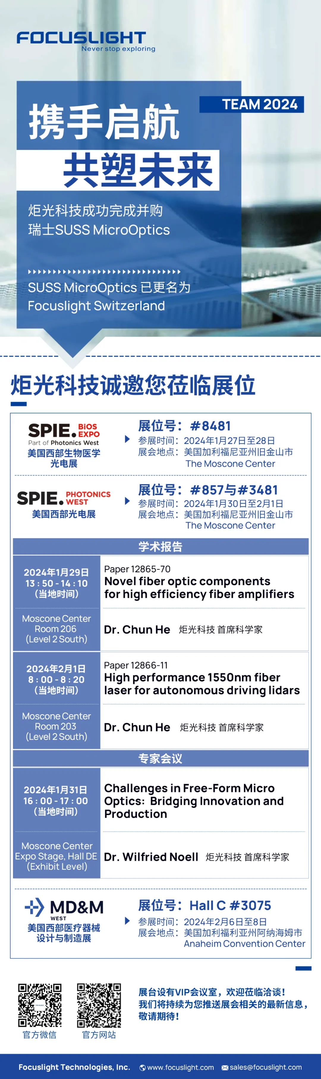 展会预告 | 炬光科技即将参加 2024年美国西部生物医学光电展、美国西部光电展及美国西部医疗器械设计与制造展