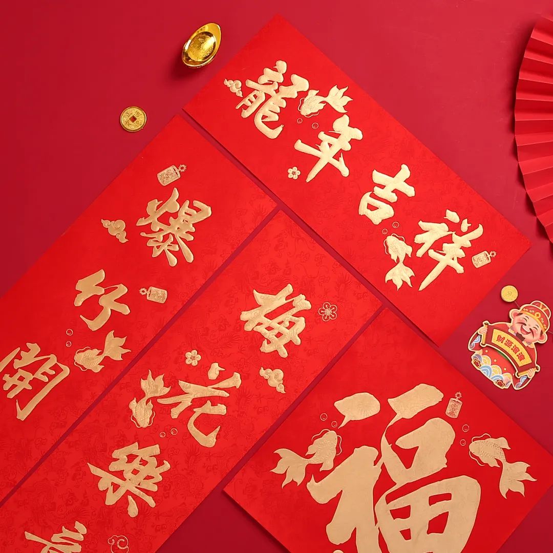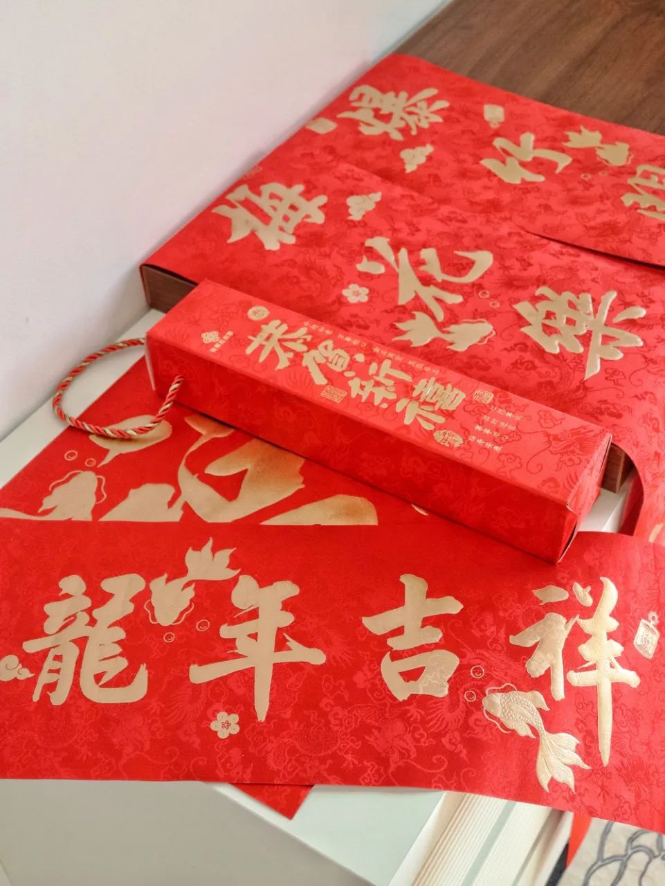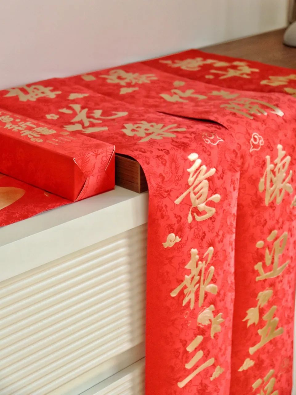 这款春联用手一摸就是细腻的质感,绸布质感,定制的图案,很难撞款,烫冷金字画bling bling很漂亮,触感丝滑,耐折耐撕,颜色艳而不俗,光泽感强。点击下方视频