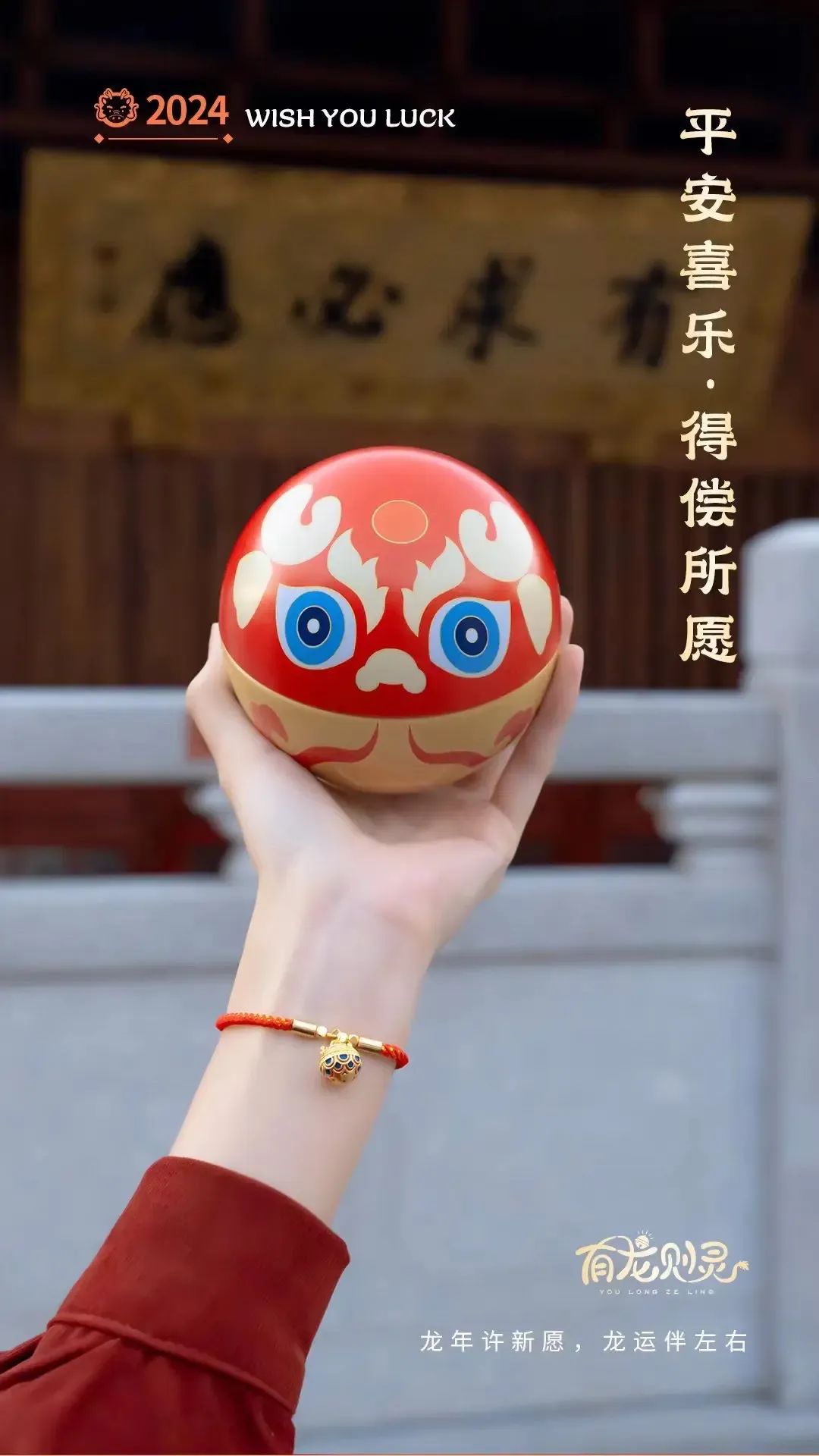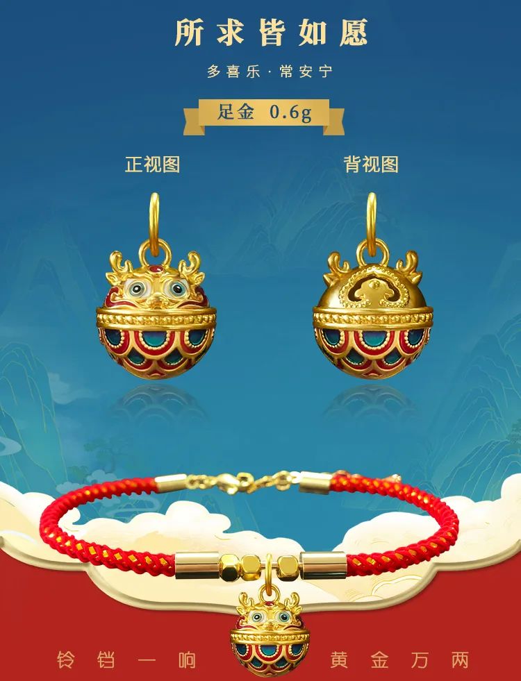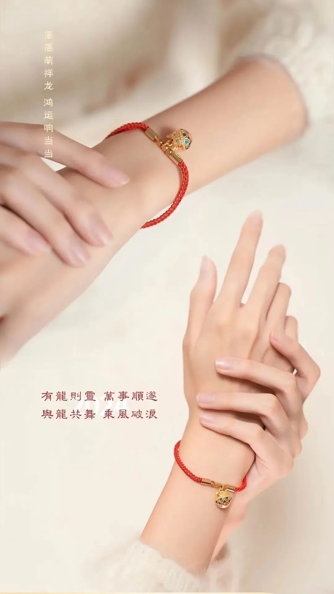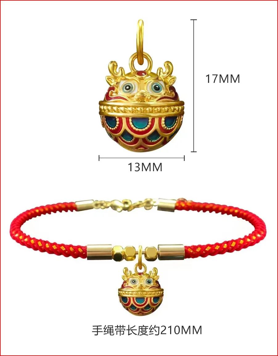 这款999足金龙年生肖饰品,将它作为“开年手串”再适合不过了!每件手链含足金0.6克!由官方出具鉴定证书,保正真品!《有龙则灵》珐琅彩手链由手编红绳、金龙、转运珠三个部分组成,外形精致灵动可爱,大人、孩子都合适佩戴,也是馈赠亲朋好友的佳礼。龙和铃铛巧妙结合,既有小龙的精神、灵气、喜庆,护佑吉祥,又有铃铛的叮当作响、灵动跳跃,带来好运。手编红绳寓意红红火火、好运相伴;金龙寓意金龙聚财、富贵吉祥;3颗转运珠则寓意三生万物、福运相随!独特的外盒包装型似龙蛋,红黄相间贵气十足,小小金龙造型活泼可爱,眉眼生动,龙鳞片片有序。