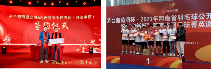 两场活动将“年文化”渲染得淋漓尽致,龙灯DIY趣味无限,书法大师金墨送福一笔一画中书写新年期许,财神人偶送红包惊喜不断,晚宴中《龙腾盛世》舞蹈,激情洋溢的乐队演唱都引得气氛高涨,现场芬芳的酒香中流淌着喜庆的热浪。爱运动、爱生活、爱茅台葡萄酒,活动期间,茅台葡萄酒公司与河南省羽毛球协会正式签约,并冠名举办“茅台葡萄酒杯”羽动中原2023年河南省羽毛球公开赛(郑州站),以传递运动精神和健康生活方式为己任,以拼搏不止的体育精神,羽动新春,美美“羽”共!