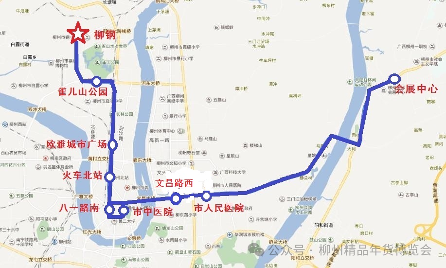 2.回程(柳州国际会展中心~柳钢):从柳州国际会展中心发车,经新柳大道、桂柳路、文昌路、文昌大桥、广场路、八一路、跃进路、胜利路、北雀路至柳钢。沿线停靠的站点有:会展中心、市人民医院、文昌路西、广场路、火车北站、欧雅城市广场、雀山公园、柳钢。