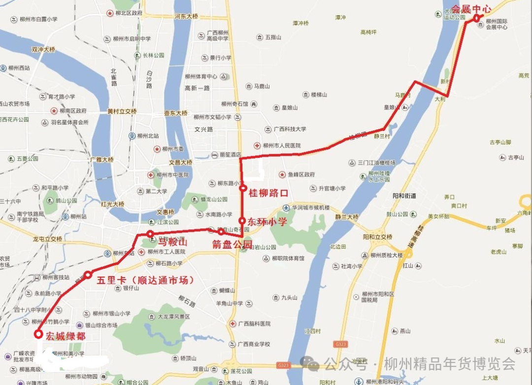 2.回程(柳州国际会展中心~航星路北):从柳州国际会展中心发车,经新柳大道、桂柳路、文昌路、东环大道、屏山大道、鱼峰路、文笔路、城站路、柳邕路至柳邕航岭路口。沿线停靠的站点有:会展中心、桂柳路口(恒大•翡翠龙庭)、东环小学、箭盘山公园、马鞍山、五里卡(顺达通市场)、宏城绿都。
