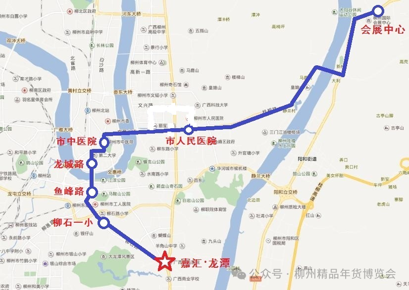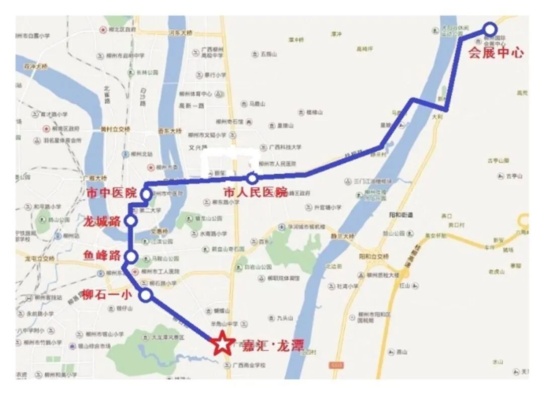 1.去程(嘉汇·龙潭~柳州国际会展中心):从嘉汇·龙潭站发车,经柳石路、鱼峰路、龙城路、解放北路、文昌路、桂柳路、新柳大道至柳州国际会展中心。沿线停靠的站点有:嘉汇·龙潭、柳石一小、鱼峰路、龙城路、市中医院、市人民医院、会展中心。