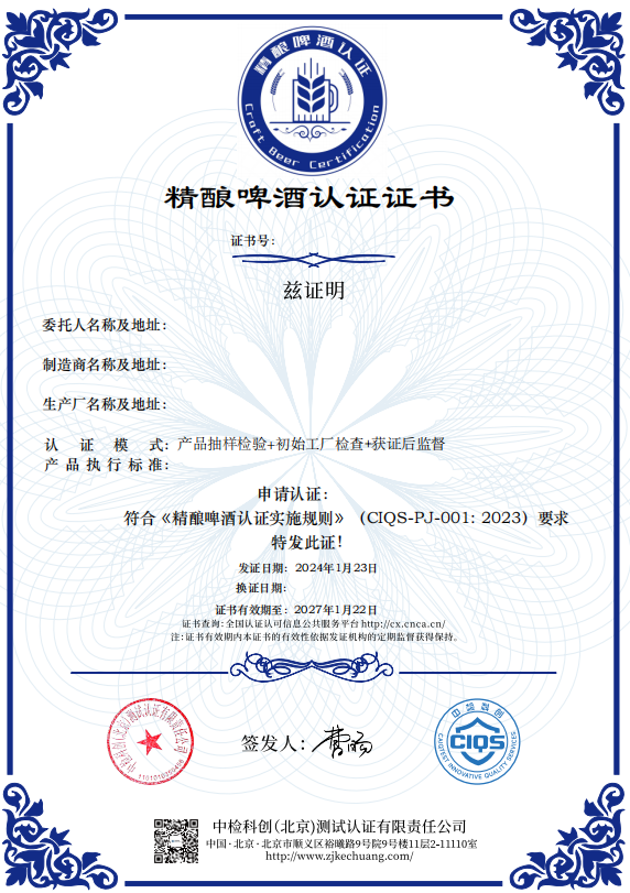 “精酿啤酒认证”是中检科创(北京)测试认证有限责任公司依据经国家认监委备案的《精酿啤酒认证实施规则》,委派国内酒类领域资深专家对申请企业生产过程中涉及的厂址环境、原辅料采购、生产过程及工艺,酿造过程全流程质量管控、HACCP食品安全管控等环节进行全面细致的检查,对生产资质及体系文件等相关信息进行核查,同时对抽样的产品进行全项检测及感官品评,评定企业产品满足《精酿啤酒认证实施规则》的过程。