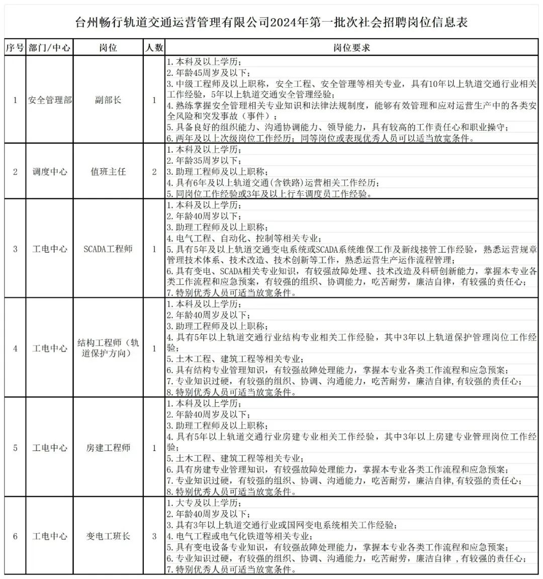 具体岗位资格、条件详见《台州畅行轨道交通运营管理有限公司2024年第一批次社会招聘岗位信息表》。