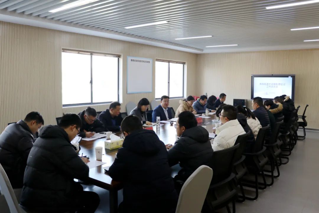 1月25日,南阳街道召开大会展配套征迁工作动员会。街道党工委副书记、办事处主任潘丹阳,街道党工委副书记於丽丽,各征迁工作组全体成员、相关村书记和评估公司有关负责人参加。