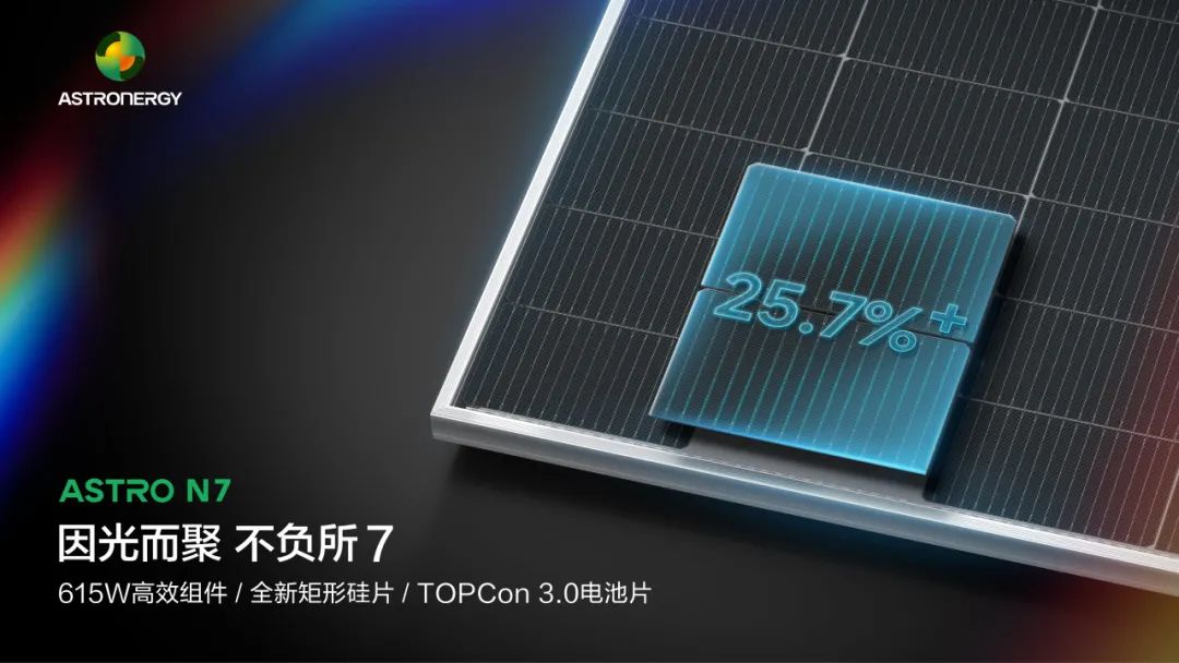 正泰新能明星产品ASTRO N7组件吸引了众多观展者驻足垂询,其优异的性能表现获得高度认可。该系列采用正泰新能自主研发的n型TOPCon 3.0电池,叠加SMBB技术,导入矩形硅片和间隙反光膜技术,组件效率最高可达22.8%,功率达615W+,并具备高功率、高效率、高可靠性、高单瓦发电量和高性价比等核心优势。